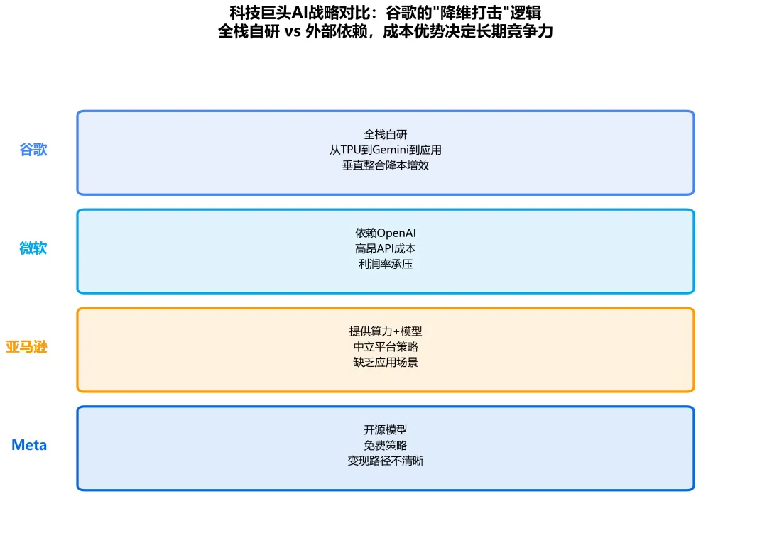 在AI时代,谷歌最大的优势不是某一项技术,而是从底层芯片到顶层应用的完整闭环。• 自2016年推出第一代TPU以来,谷歌已迭代至第五代• TPU专为Transformer架构优化,训练效率远超通用GPU• 掌握芯片设计能力,意味着在算力军备竞赛中不受制于人• Gemini是谷歌的"王牌",多模态能力全球领先• 原生支持文本、图像、视频、音频,无需多模型拼接• 持续迭代,Gemini 3.0即将发布,性能再次跃升• 提供模型即服务(MaaS),95%头部SaaS公司已接入• 与AWS、Azure形成三足鼎立,市场份额稳步提升• AI Overviews(AI摘要)已覆盖搜索结果,用户体验显著提升• YouTube推荐算法持续优化,用户停留时间增加• 地图、Gmail、Photos等产品深度集成AI,形成"无处不在"的AI体验这种"毛细血管式"的渗透,让谷歌的AI能力无缝融入用户日常生活。3.2 对比竞争对手:谁更具长期竞争力?
