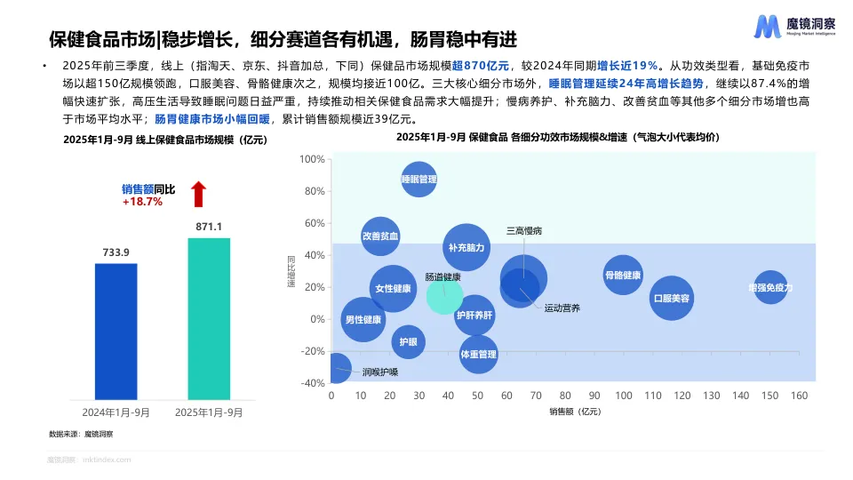 - 市场规模:2025年前三季度,线上肠胃健康保健品销售额达38.8亿元,同比增长14.5%。