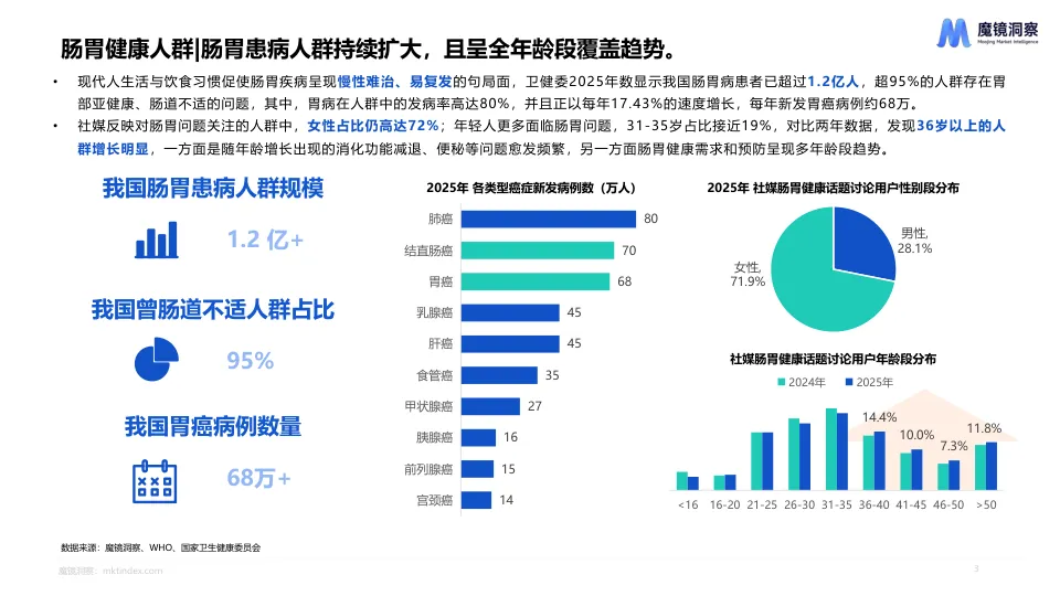 - 用户基础庞大:我国肠胃病患者超1.2亿,超95%的人存在肠胃亚健康问题,需求广泛且呈全年龄段覆盖趋势(年轻人和36岁以上人群增长明显)。