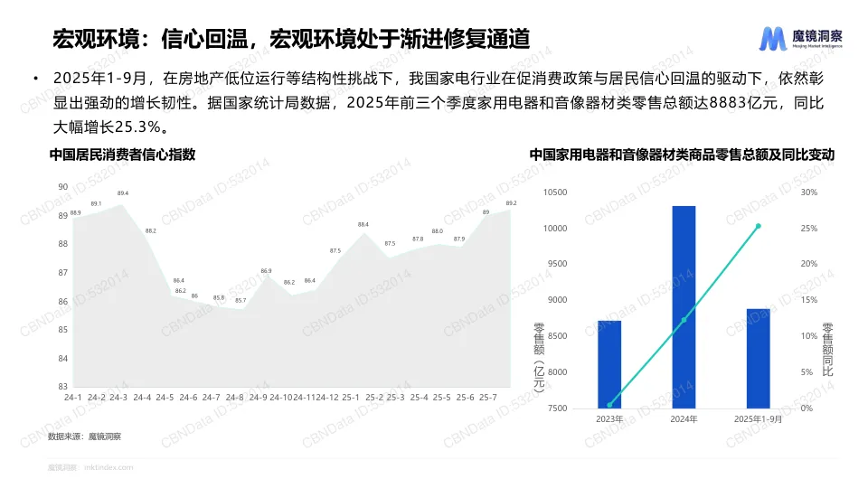 - 整体增长:2025年前三季度,家电零售总额达8883亿元,同比大增25.3%,主要受“以旧换新”等政策强力刺激。
