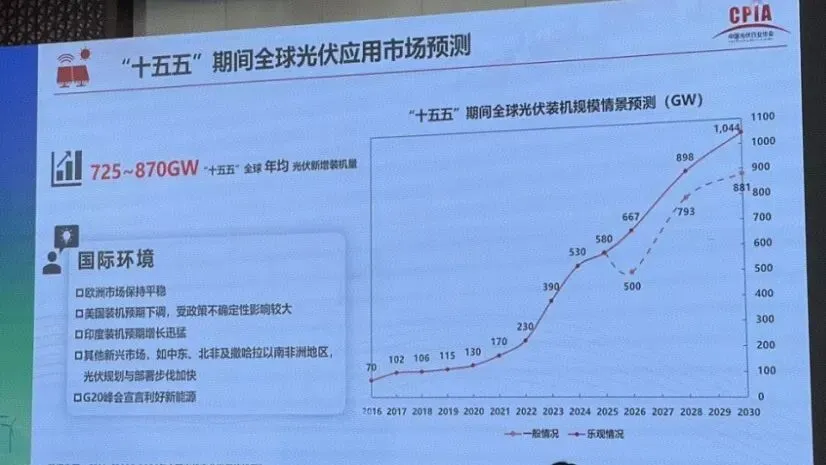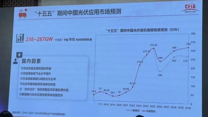 会上发布的路线图预计,2026年中国新增光伏装机规模为180GW至240GW,全球新增光伏装机规模为500GW至667GW。更长时间来看,预计“十五五”期间(即2026年至2030年),中国年均光伏新增装机规模为238GW至287GW,全球年均光伏新增装机规模为725GW至870GW。两个市场的趋势均为2026年回调,此后回归上升通道。