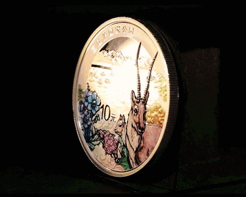 30克银币背面采用镜面底面,主图案采用多层次喷砂和彩喷工艺。最远处绵延的山脉以陡峭的浮雕制作手法,辅助手工喷砂渐变工艺,借用纯砂的白色体现了“雪山之王”的特色,又通过渐变处理表现山脉的起伏错落和白雪皑皑的景观。与山脉相连湿地与河川则采用低浮雕表现手法,渐变喷砂由远及近,虚实结合,给人以强烈的纵深感。近景以藏羚羊、绿绒蒿为主元素,鲜明的色彩带给人生机盎然,欢快活泼的大自然景观。