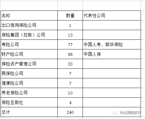 根据国家金融监督管理总局公布的《保险机构法人名单》所显示信息,截至2023年9月末已经在国家金融监督管理总局注册并且有相关信息公开的正规保险机构一共有240家,其中财产险公司88家、人身险公司77家、保险集团(控股)公司13家、养老保险公司10家、再保险公司7家、健康险公司7家、保险资产管理公司33家,其余为4家保险互助社及1家出口信用保险公司。