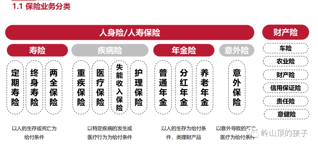 保险公司的产品可以分为两大类:人身保险和财产保险。