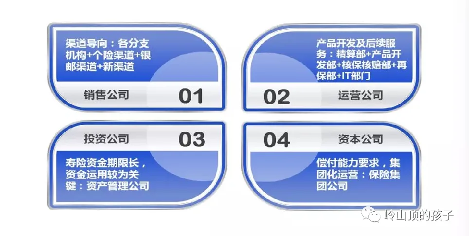 人寿保险公司:以人的生存、死亡或疾病为保险标的;以寿险精算为基础;以长期业务为主。