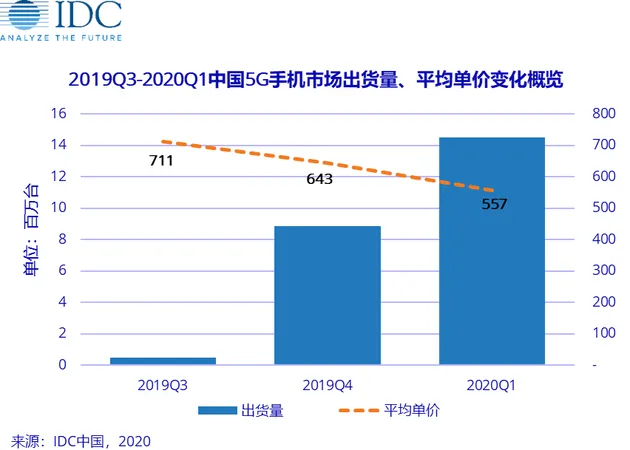 报告显示,5G手机已经正式进入市场大概三个季度,这三个季度国内5G智能手机出货量累计达2380万台,属于逐渐增长状态;5G智能手机的平均单价呈现日渐下降的状态,到2020年第一季度,5G手机的平均单价约为557美元(折合人民币约3940元)。
