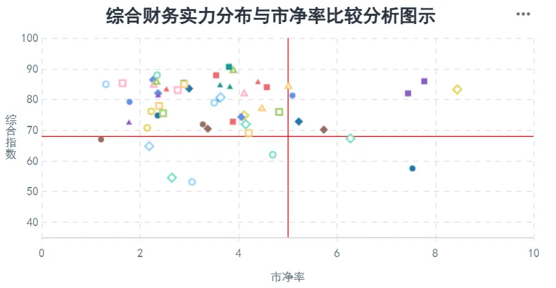 在公司的发展能力、经营稳定性及增长潜力的基础上,结合公司主营业务所属行业的分析、资产结构或资产质量分析、主营业务运营效率分析、受评主体的行业地位分析以及偿付能力的分析做出的公司综合财务实力分析判断。分数越高,公司的综合财务实力越强。处在右下区域的公司,市净率较高且相关指数较低,则存在公司综合财务实力不足的潜在风险。