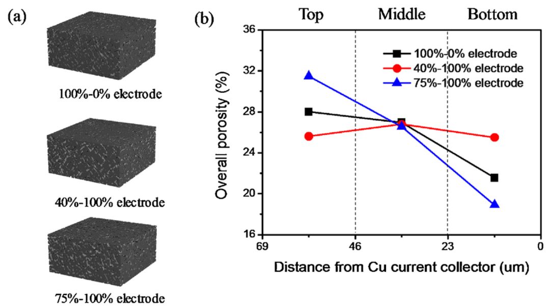 图4.负极极片经三种不同方式辊压后的(a)3D-XRM重构图像和(b)极片上、中、下部位的孔隙率对比。