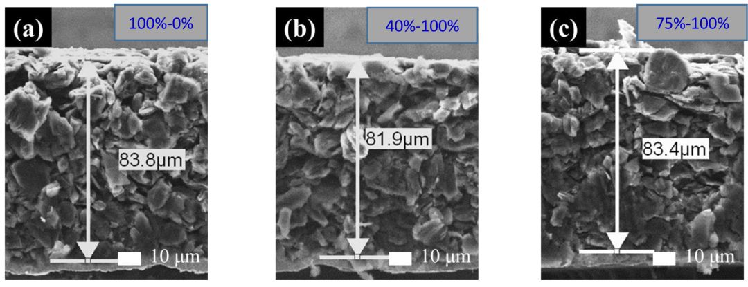 电池的膨胀主要来源于负极,作者将三种不同方式辊压的石墨负极制成了LiCoO2软包电池,并对膨胀情况进行了对比。如图6所示,经40%-100%两次辊压的负极极片制成的软包电池在化成和循环阶段的膨胀率分别为19.23%和4.47%,膨胀率在三组电池中最低。作者认为均一的孔径分布使得40%-100%两次辊压的负极极片能够很好的被电解液浸润且释放化成和循环过程极片的压力,从而得到最小的膨胀率结果。如图7所示,负极极片活性层初始设计厚度为70μm,经25周循环后100%-0%一次辊压、40%-100%两次辊压和75%-100%两次辊压极片的活性层厚度分别为83.8μm、81.9μm和83.4μm,40%-100%两次辊压极片的厚度最低,与软包电池的膨胀率结果相一致。此外,作者还对三种极片制成的软包电池的循环性能、倍率性能和电化学阻抗谱进行了分析,结果均显示使用40%-100%两次辊压极片制成的软包电池性能最优,在此不一一赘述。