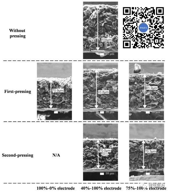 图7.三种不同方式辊压的负极循环25周后的SEM图像及尺寸信息。