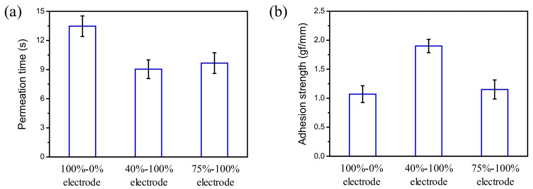 图5.负极极片经三种不同方式辊压后的(a)电解液浸润对比和(b)极片粘结力对比。