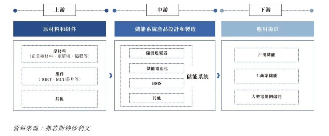 储能系统产业链主要涵盖上游、中游和下游三个环节。上游包括正负极材料、电解液、隔膜等基础原材料,以及IGBT等功率器件和MCU主控芯片等关键组件。中游环节主要为储能系统产品的设计与制造,涵盖储能逆变器、储能电池、BMS等核心设备,共同集合成为完整的储能系统解决方案。下游则面向多元应用场景,分为户用储能、工商业储能和大型电网侧储能。