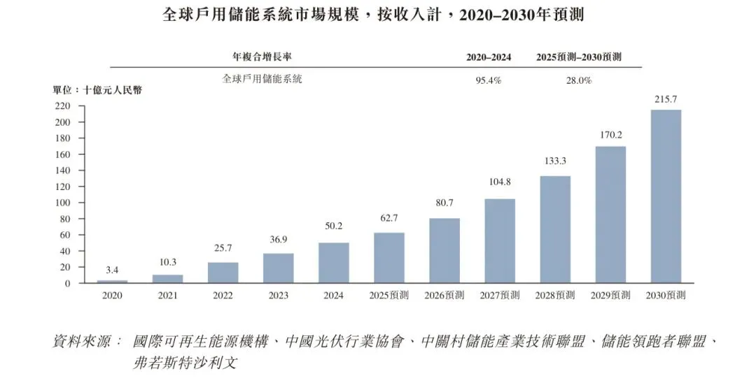 受全球户用储能系统加速部署、户用电价上涨及能源自用与备用电源需求增长的驱动,全球户用储能系统市场已实现快速增长。市场规模由2020年的34亿元人民币增至2024年的502亿元人民币,复合年增长率达95.4%。预计市场规模将持续扩大,从2025年的627亿元人民币增长至2030年的2,157亿元人民币,对应复合年增长率为28.0%。