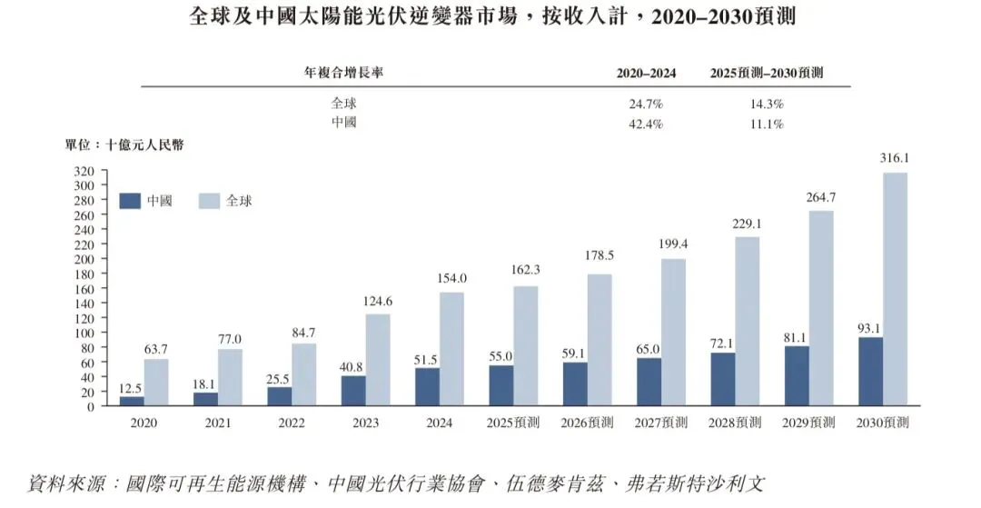 受碳中和与能源转型政策驱动,全球太阳能光伏逆变器市场按收入计从2020年的637亿元人民币增长至2024年的1,540亿元人民币,复合年增长率达24.7%。同期中国市场收入从125亿元人民币扩大至515亿元人民币,复合年增长率达42.4%。随着全球光伏装机持续推进,市场规模预计将保持稳健增长。到2030年,全球和中国市场规模预计将分别达到3,161亿元人民币和931亿元人民币,2025至2030年期间的复合年增长率分别为14.3%和11.1%。