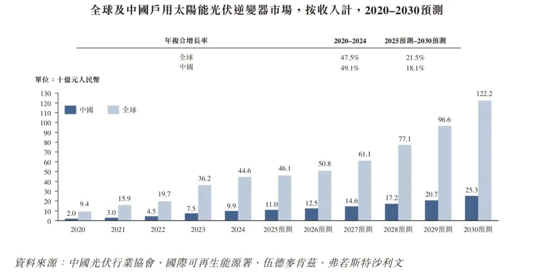全球能源价格波动加速了户用绿色能源的普及。全球户用太阳能光伏逆变器市场从2020年的94亿元人民币增长至2024年的446亿元人民币,复合年增长率达47.5%。同期中国市场从20亿元人民币增至99亿元人民币,复合年增长率达49.1%。预计到2030年,全球及中国市场将分别达到1,222亿元人民币和253亿元人民币,2025至2030年期间年复合增长率分别为21.5%和18.1%。