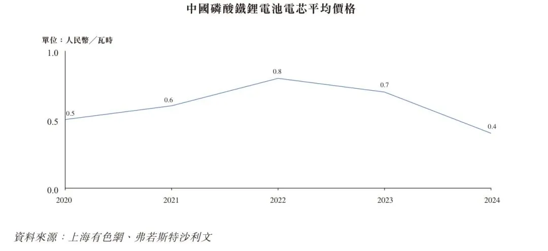 作为储能电池包电芯的关键原料,磷酸铁锂(LFP)的价格是决定电芯成本的主要因素。2020年至2022年,全球公共卫生事件引发的能源转型需求激增和供应链波动导致原材料成本快速上涨,使得LFP电芯的平均价格从0.5元╱瓦时上涨至0.8元╱瓦时。自2023年起,电动汽车和储能市场的快速发展显著提升了供应链产能。随着供应链由短缺转为过剩,原材料价格下降,到2024年,LFP电芯的价格降至0.4元╱瓦时。受行业产能利用率提升及原材料价格上涨的双重推动,2025年LFP电芯价格逐步回升。