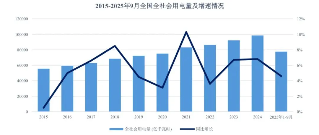 根据国家能源局统计,2015 年至2024 年,我国全社会用电量从 5.55 万亿千瓦时增长到 9.85 万亿千瓦时,年均复合增长率为 6.58%;2025 年 1-9 月,我国全社会用电量为7.77 万亿千瓦时,同比增长 4.60%。根据中电联预测,“十五五”期间,我国全社会用电量预计仍将保持较快增长态势。到 2030 年,我国全社会用电总量预计将突破 13 万亿千瓦时。
