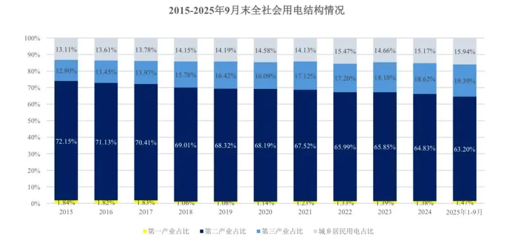 在用电总量平稳增长的同时,伴随产业结构调整,我国电力消费结构持续优化。在全社会用电量中,第二产业用电量一直保持用电主体地位,但其用电量占比持续下降,从 2015 年的 72.15%下降至 2025 年 1-9 月的 63.20%,而第三产业用电占比则从12.90%增长至19.39%,反映出我国经济结构向服务化、高端化转型的态势。