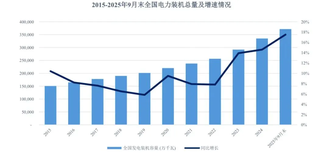 我国电力装机规模近十年以来保持快速增长态势。2015 年至2024 年,全国发电装机容量从15.07 亿千瓦迅速扩张至33.49 亿千瓦,年均复合增长率达9.28%;截至 2025 年 9 月末,全国发电装机容量已达 37.17 亿千瓦,同比增长 17.50%,已提前实现了《2025 年能源工作指导意见》中提出的“2025 年全国发电总装机达到36 亿千瓦以上”的目标,为电力安全供应奠定了坚实的基础。