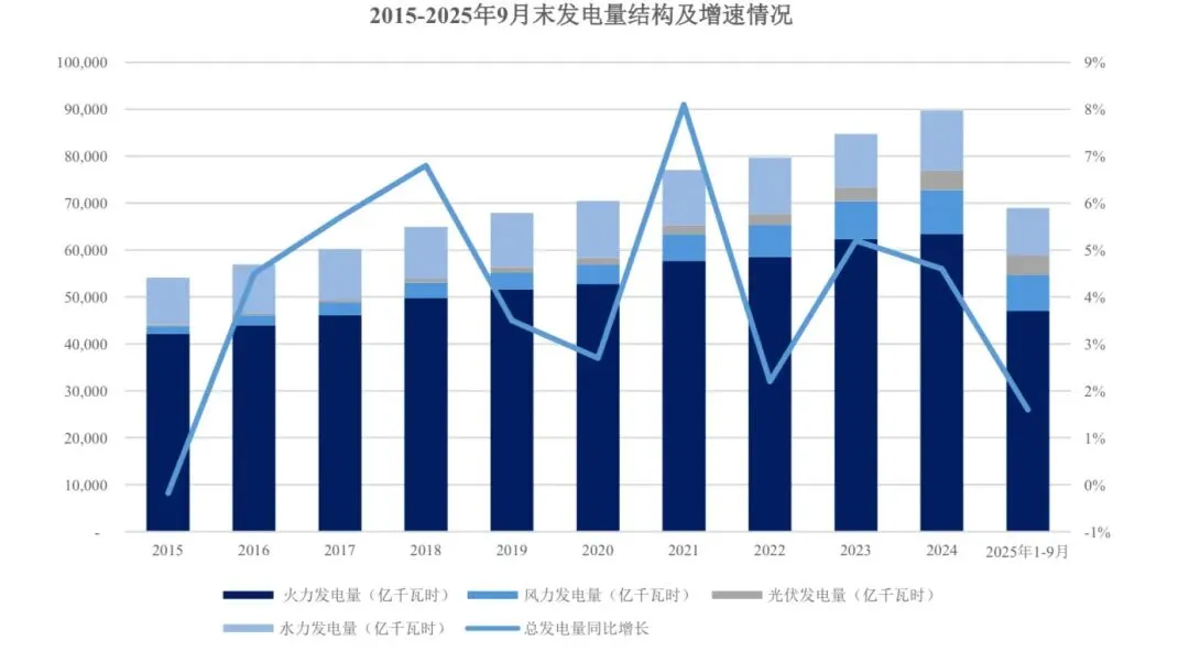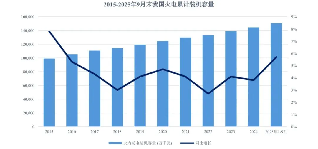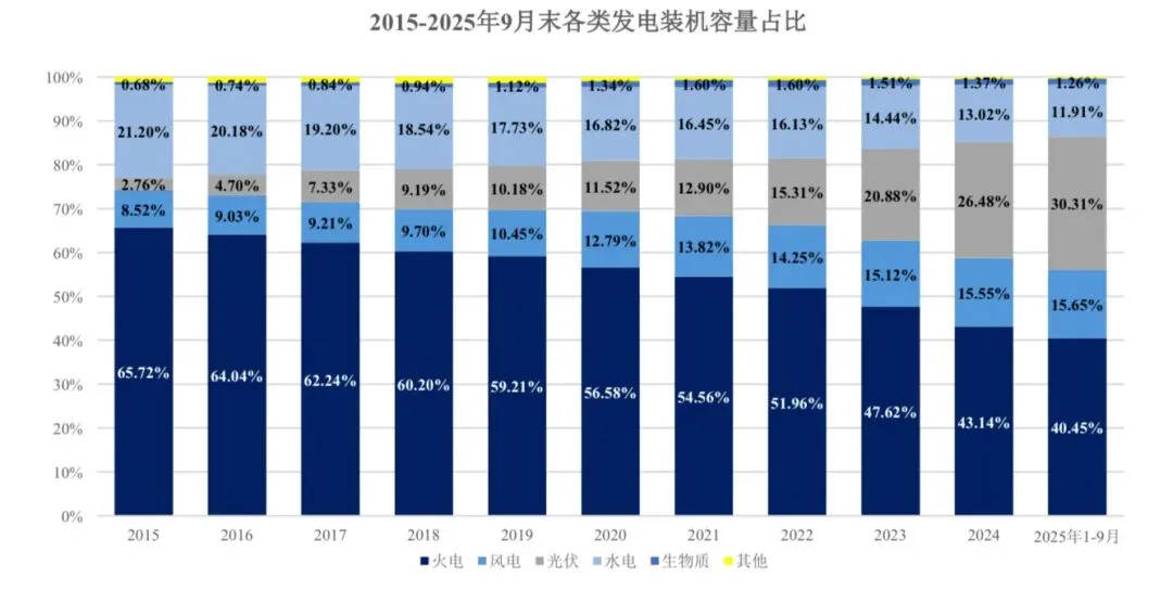 近年来,火力发电装机比重持续下降,新能源装机比重明显上升。截至 2025年9 月末,火电装机容量占比下降至 40.45%,较 2015 年下降了25.27 个百分点,呈显著下降趋势。“碳达峰”和“碳中和”目标对电源结构的转变提出了新的要求,在此背景下,我国可再生能源装机容量比重将持续提升,火电装机容量比重将持续保持下降趋势,火力发电装机容量增速将明显放缓。