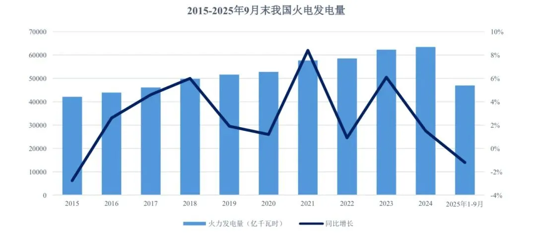 从发电量来看,2015 年全国火力发电量为 4.21 万亿千瓦时,占全国总发电量的比重达75%。随着国家对可再生能源的大力发展及风电、光伏发电等新能源技术的不断进步,火力发电总量虽保持波动增长,但增速已明显放缓,且占比逐年降低。2025 年1-9 月,全国火力发电量为 4.70 万亿千瓦时,同比下降 1.20%,占全国总发电量的比重降至 64.73%,延续了下降趋势。