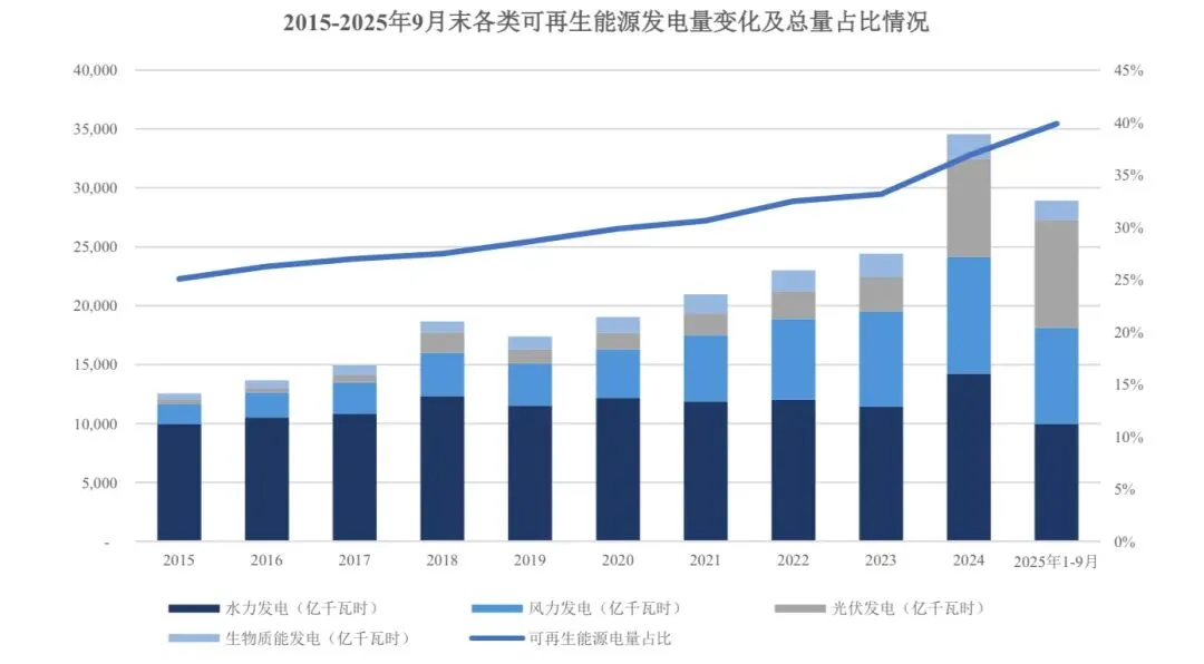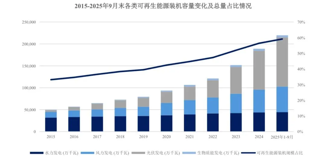 在“双碳”战略驱动下,可再生能源已发展成为电力系统增量装机的绝对主体和电力供应的核心增长极。 2015 至2024 年我国可再生能源装机规模快速增长,占比由 33.16%增长至 56.42%,截至 2024 年末,我国可再生能源装机规模达到18.89 亿千瓦,同比增长 24.58%,其中风电光伏装机规模突破 14.07 亿千瓦,已提前6 年实现“2030 年风电、光伏发电总装机 12 亿千瓦”的国家自主贡献目标,充分展现了新能源发展的“中国速度”与坚定决心。2025 年我国可再生能源装机规模持续扩大, 1-9 月新增可再生能源装机规模3.10 亿千瓦,同比增长47.70%,约占新增装机的84.40%,在我国电力能源结构中的地位不断提升。截至 2025 年9 月末,我国可再生能源装机规模已达 21.98 亿千瓦,占比达59.13%。