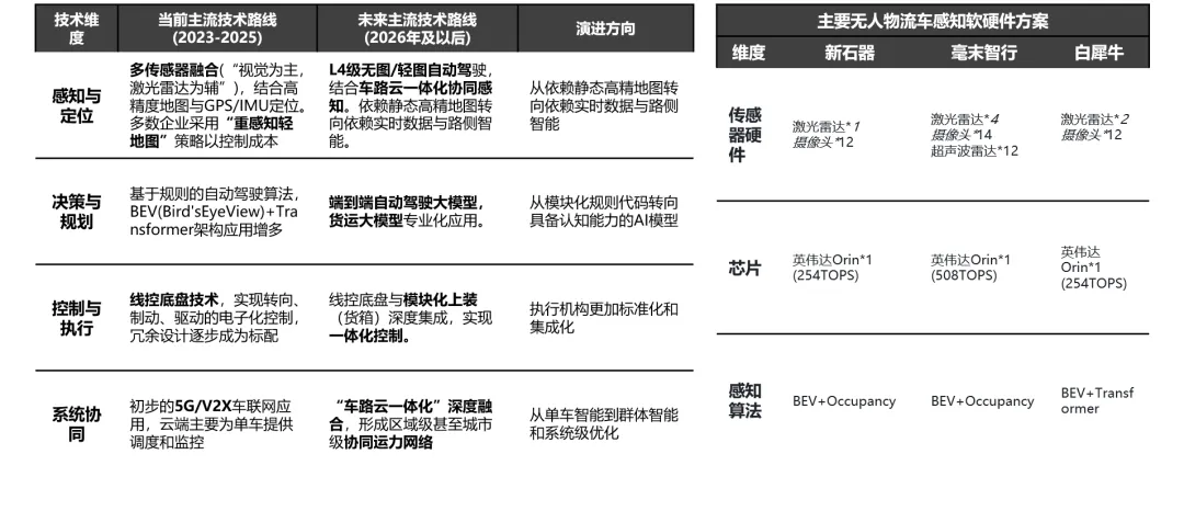 无人配送车的自动驾驶等级多聚焦 L4 级,聚焦封闭园区、城市末端等限定场景,核心技术栈涵盖感知、决策、控制三大模块。感知层依赖激光雷达、摄像头、毫米波雷达等多传感器融合,实现对障碍物、路况的精准识别;决策层通过 AI 算法与大模型,应对动态场景下的路径规划与风险规避;控制层则保障车辆稳定执行指令。当前行业仍面临技术瓶颈,如极端天气下感知精度不足、复杂路况决策延迟、核心硬件成本过高等,制约技术规模化落地。
