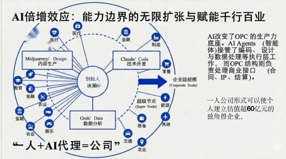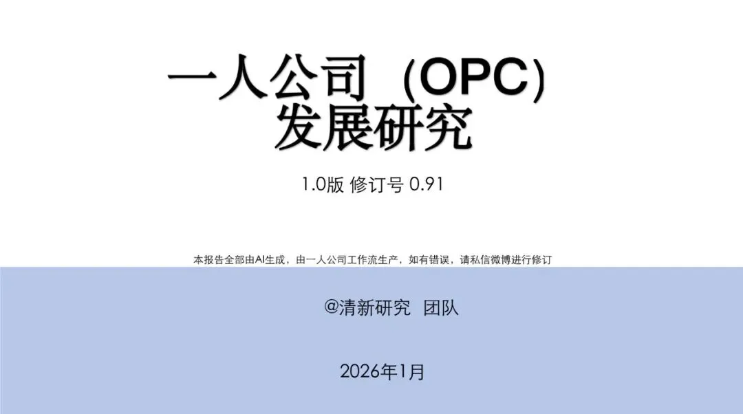 我来为您解读这份清华大学发布的《2026一人公司(OPC)发展研究报告》。这份报告由AI生成,采用"一人公司工作流"生产,探讨了AI时代下个体创业的新范式。报告将一人公司定义为单一股东与有限责任的制度结合。它享有完全的法人人格,股东仅以出资额为限对公司债务承担责任。报告强调,这不是简单的个体户升级,而是AI赋能下"个体商业能力极度放大"后的合规化形态。从发展脉络看,2023年前是零工经济/副业时代,2023-2025年进入AI增强个体阶段,而2026年标志着一人公司OPC成为主流创业结构。能力液态化——AI填平了所有技能洼地。创始人不再有明显短板,可以通过AI"取高补低",将自身原有天赋与AI赋能层结合,填补需求与执行之间的空白。这要求创始人具备两种关键能力:鉴赏力(知道什么是好的)和提问力(精准描述需求)。极致个性化——向内,工作流适应人而非人适应工作流;向外,提供的商品和服务高度个性化,精准匹配细分市场需求。AI作为人类集体智慧,让每个人都能在无限的知识组合中找到自己的个性化路径。硅基生产化——从"人雇佣人"的传统碳基逻辑,转向"人雇佣数字员工"的新硅基逻辑。线性碳基生产力加上指数硅基生产力,形成新质生产力。历史学视角:从19世纪受限于地理半径的家庭作坊,到21世纪全球市场触达的数字工作室,OPC是在更高维度上回归"自主经营",杠杆从家庭人力变为数字技术。经济学视角:非雇主企业数量持续增长,"X即服务"模式让个人按需租用生产资料,通过"数字员工"和"算力Token"获取规模经济,而非资本支出。心理学视角:一方面,自我决定理论指出自主性、能力感、归属感是核心燃料;另一方面,多角色切换带来的认知负荷是重大挑战,解决方案是将重复性决策外部化或自动化。技术哲学视角:AI从"工具"变为"合伙人",人与算法构成共生系统——人类负责价值观与创造性决策,机器负责海量执行与效率优化。报告提出基于多智能体的企业架构:人类创始人作为CEO/战略/价值观中心,周围环绕着Marketing Agent(内容生成/广告投放)、CS Agent(7×24客户响应)、Dev Agent(代码维护)、Finance Agent(记账/税务申报)、Ops Agent(库存/物流追踪)等专门化AI代理。技术实现上采用三层架构:执行层(LLM Agents负责任务拆解与执行)、协作层(Multi-Agent角色扮演)、连接层(Automation连接应用与数据流)。通过API将企业级功能模块像乐高积木一样拼装,无需自行开发底层设施。内容创作与媒体:AI短剧、个性化故事、AI漫画、特效剪辑、AI播客——瓶颈从"生产"转向"策划"与"审美"。数字产品与电商:虚拟物品、定制壁纸/表情包、AI艺术/NFT、数字模板——零物流、零库存,利润率极高。工具与软件服务:垂直图像工具、文案助手、代码生成、自动化工作流、数据可视化——"微SaaS"模式,一人维护后端,AI负责前端。教育与知识传播:个性化学习路径、AI知识问答、技能微课、AI职业规划——提供比传统课程更精准的"私教"体验。专业咨询服务:市场洞察报告、法律模板、商业计划书——单人交付传统咨询公司团队级成果。娱乐与生活方式:AI虚拟伴侣、生活建议、梦境与冥想——情绪价值成为新增长点。连接者——专业合规与数据服务,如跨境电商数据合规清洗、GDPR合规咨询。赋能者——垂直场景智能体,如"AI+硬件"解决线下实体痛点,典型案例是9.9元NFC智能卡让小店实现数字化。构建者——技术落地与运作,帮助企业部署大模型、客服系统及私有化知识库。报告提出"万能套利公式":找需求(稀缺的内容、审美或知识)+ 找供给(国内外低成本成熟资源)+ 做撮合(翻译、AI再生产、本地化优化)= 赚取差价。但同时也警示了伦理风险:算法资本可能加剧不平等——掌握AI杠杆者能力指数级增长,而被算法支配者仍线性增长;数字鸿沟、社会保障缺失的"不稳定无产者"风险、长期隔离带来的心理孤岛效应等。最终,报告将全球政策路径概括为"温室模式"(中国路径,聚焦AI+OPC产业园、算力补贴、硬件基建)与"雨林模式"(国际路径)的双向互动,核心公式归结为:1人 + AI = 1公司。部分内容预览