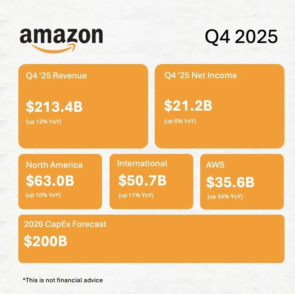 2026年2月6日盘后,Amazon也交出了一份强劲的Q4 2025财报:营收创历史首次突破 $2000亿,AWS增速达3年最快,广告业务继续高歌猛进。然而,股价应声暴跌 15%。