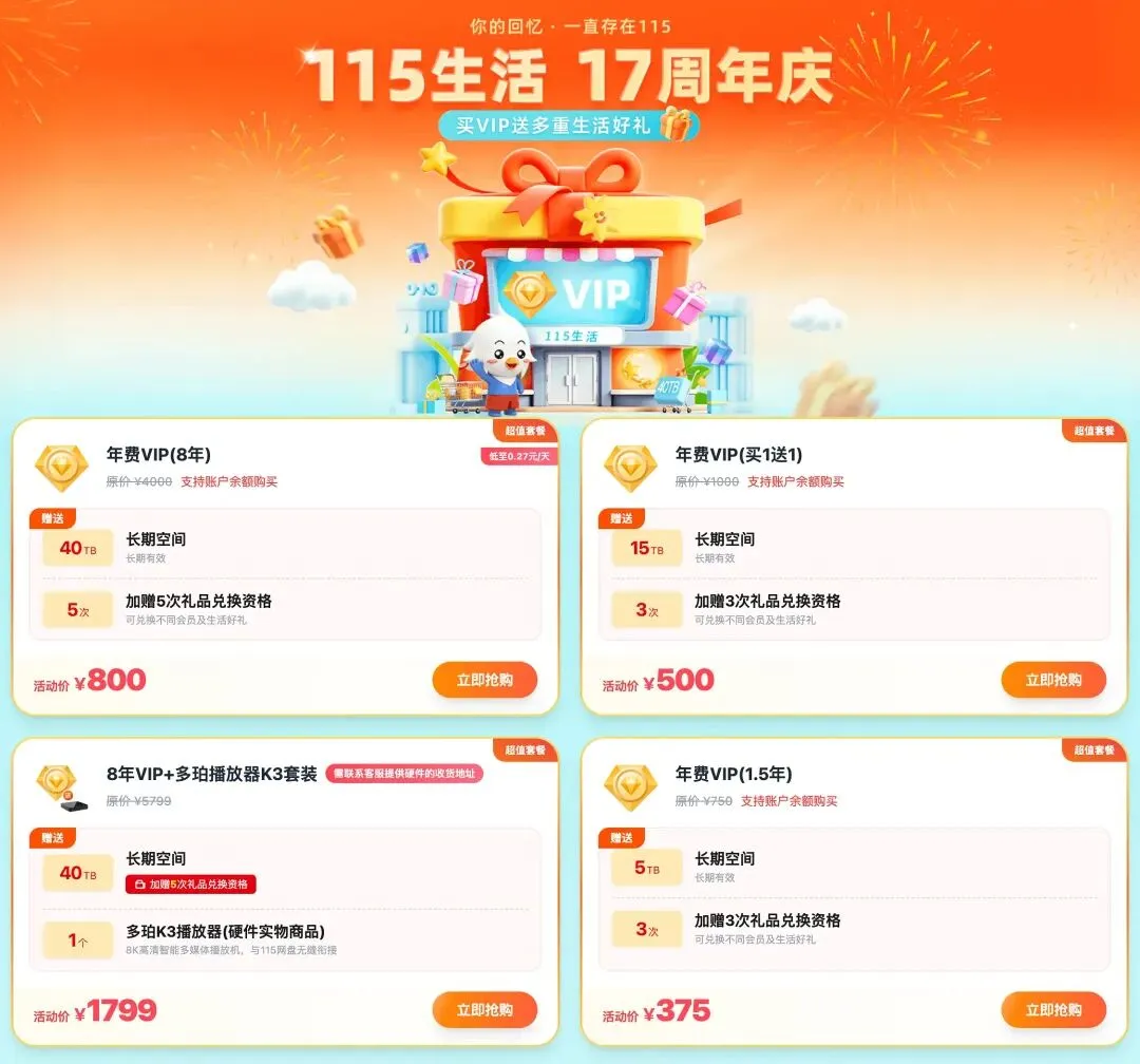 此次 8 年 VIP 会员优惠活动具有明确的时效性,它是 115 网盘周年庆期间特有的限时限量活动。这与 115 网盘日常 500 元 / 年的会员定价形成鲜明对比,凸显了活动期间的价格优势。限时特性意味着用户需要在特定的时间窗口内抓住机会购买,一旦活动结束,将无法再以 800 元的优惠价格获取 8 年 VIP 会员资格,只能按照日常价格续费或购买。限量则表明活动提供的优惠名额并非无限,先到先得,这也在一定程度上增加了活动的紧迫感,促使有需求的用户尽快做出决策。