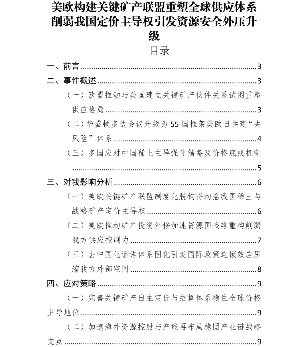 会议期间,美欧联合发布行动声明,将“供应链多元化”“价格下限机制”“战略储备协同”确立为制度化合作方向,标志全球矿产供应体系进入以“去中国化”为主线的新阶段。此举不仅改变资源贸易格局,更涉及产业链安全、地缘经济竞争及国际规则重塑,具有直接战略指向。当前形势表明,关键矿产领域正成为大国博弈的新前沿,相关政策动向已对我国供应安全与产业主导力构成系统性挑战。