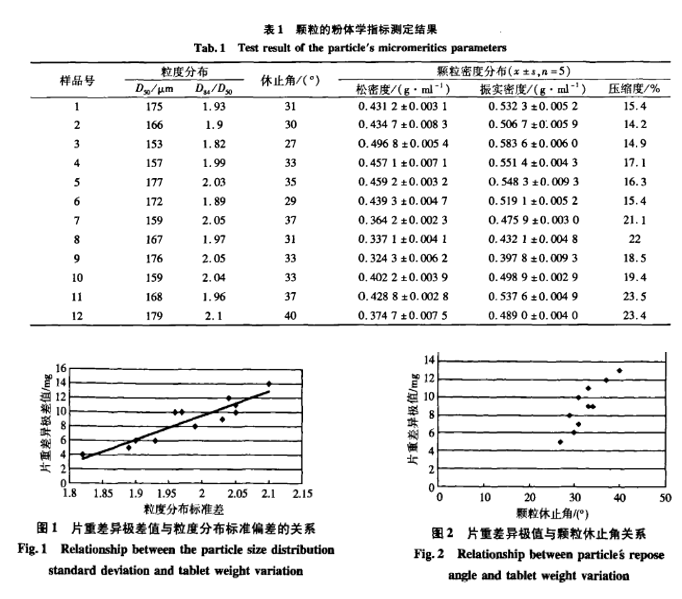 粒径大小及分布对于物料的可压性、片重差异及溶出度均有很大的影响。物料粒径大小对片剂压缩成型的影响主要体现在粒子间的结合面积、结合强度及其相互作用上。一方面,物料粒径越小,粒子的比表面积和孔隙率越大,受压时其变形越大、接触面变多,结合力点越多结合越紧密,有利于增加片剂的抗张强度。对于结晶型药物而言,减小粒径会增大晶体结构中的缺陷,晶体破裂从而增加粒子之间的结合力,提高物料的压缩成型性。另外,粒度分布的变化会引起物料混合均匀性和压缩特性的改变。粒径分布小、粒子分布相对集中,在压片过程中,使得冲模填充均匀,减小片重差异,提高物料的压缩成型性。所以,在片剂生产前的准备过程中,要严格控制物料的粒径及分布情况,若粒径不达要求,可通过机械粉碎、气流粉碎、过筛、研磨等方式获得相应需求的粒径及分布。例如:以下文献用中间粒径D50来表征颗粒的平均粒径,用标准偏差表示颗粒粒径分布的离散程度,其值越小,表明粒径分布越集中。结果可知随着颗粒粒径分布标准偏差和休止角的加大,所得片剂的片重差异极值也随之增大[4]。