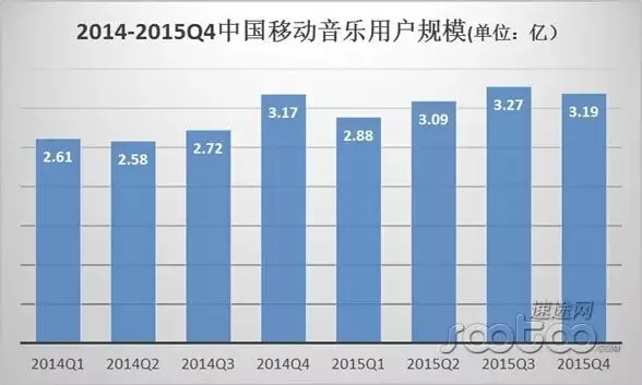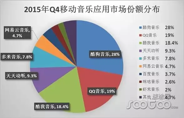 2015年第四季度移动音乐用户规模达3.19亿,较上个季度略有下滑,环比略有上涨。用户规模下滑主要是因为盗版音乐下架问题,部分平台盗版音乐下架后出现无曲可听的地步。大量用户开始流失,并向拥有版权的平台集中。其中QQ音乐、酷狗、酷我由于多年长期布局正版音乐市场,成为此次的受益者,用户大量的向其集中。