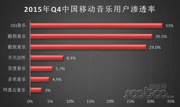 2015年第四季度中国移动互联网市场中移动音乐APP中QQ音乐用户渗透率达到33%,排在第一位;酷狗音乐、酷我音乐用户渗透率分别为30.5%、29%;天天动听、百度音乐用户渗透率分别为8.4%、5.7%。