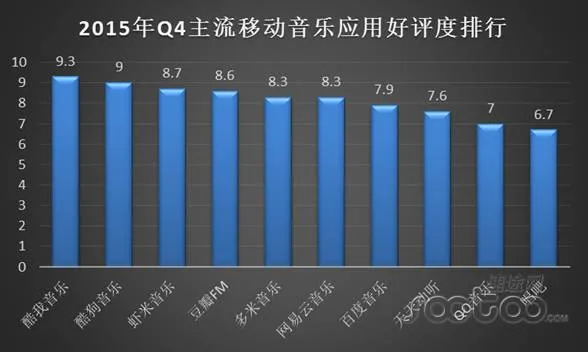 2015年第四季度十大移动音乐好评榜单可以看出,酷我音乐、酷狗音乐的好评变化不大,继续保持在第一与第二位;虾米音乐在本季度已8.7分的成绩超过多米音乐排在第三位;豆瓣FM以8.6分排在第四位;多米音乐、网易云音乐、百度音乐、天天动听、QQ音乐、唱吧分别排在第五到第十位。