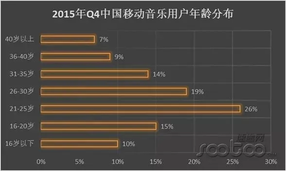 从移动音乐用户的年龄上可以看出,80后、90后已经成为音乐用户的主体。21-25岁的人群占比达26%;26-30岁的人群占比达19%;16-20岁的人群占比达15%;31-35岁的人群达14%。