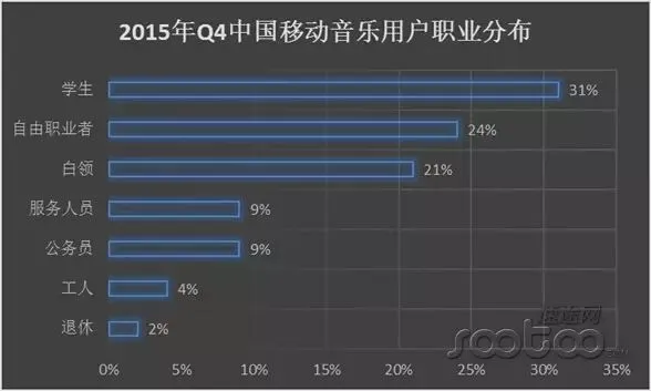 从移动音乐用户的职业构成可以看出,学生占比最高达31%;自由职业者、白领分别为24%、21%。服务人员、公务员、工人占比分别是9%、9%、4%。