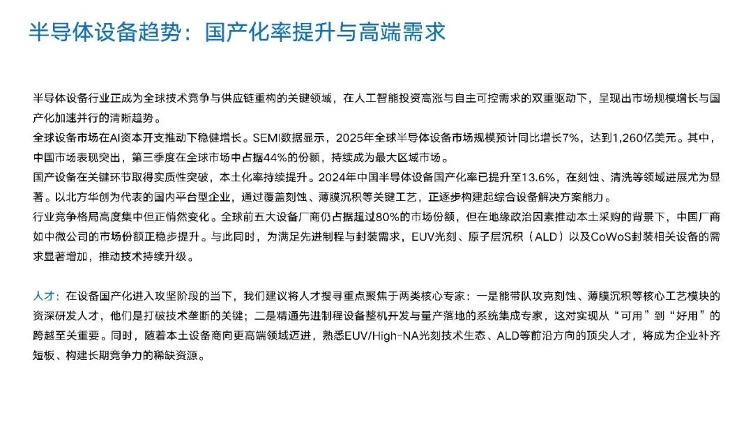 2026年,全球半导体行业将进入结构性增长周期,预计市场规模同比增长26%至9,750亿美元。增长由人工智能需求主寻,逻辑芯片与存储芯片板块增速尤为显著,预计分别达到32%和39%。核心动能源自Al基础设施投资的持续扩大,以美国四大云厂商为例,2025年资本支出预计达3,670亿美元,2026年将进一步攀升至4,950亿美元,强力支撑从算力、存储到光模块的产业超级周期。
