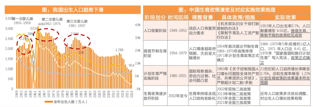 新中国成立以来,共有 37 年出生人口数量超过 2000 万,形成了 1950~1958 年、1962~1975 年、1981~1997 年三个显著的「婴儿潮」 ,累计出生人口分别为 2.06 亿、3.62 亿和 3.75 亿,年均出生人口为 2077 万、2583 万和 2206 万,三次人口出生高峰成为后续人口发展的「生源」 ,但第四次「婴儿潮」并未明显出现,且第二次「婴儿潮」已于 2022-2035 年相继步入老年期。结合生育政策来看,2013 年、2015 年我国先后实施「单独二孩」与「全面二孩」相关生育政策等调整措施,13-15 年期间出生人口数分别为 1640、1687 和 1655 万人,并于 2016 年达到 1786 万阶段性高点后逐步回落;在 2021 年实施全面三孩政策后,出生人口在 2024 年有所回升,为 8 年内首次增长。