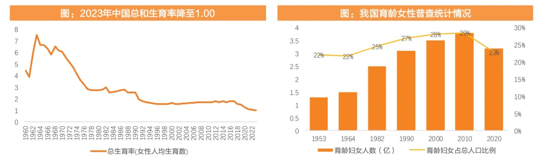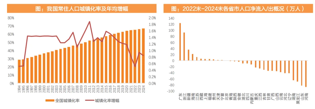 人口发展核心态势:1)近年出生人口呈下滑态势:2013 年、2015 年我国先后实施「单独二孩」与「全面二孩」相关生育政策调整措施,在 2016 年达到 1786 万阶段性高点后逐步回落;在 2021 年实施全面三孩政策后,出生人口在 2024 年有所回升,为 8 年内首次增长。2)生育率、育龄规模呈下行趋势:根据世界银行数据,2023 年我国总和生育率已降至 1.00,较 2017 年峰值下降超 40%;我国育龄妇女规模自 2011 年 3.8 亿峰值后逐年下降,2022 年降至 3.1 亿,2023 年再减少 300 多万人。3)人口流动与城镇化特征:2024 年城镇化率达 67%,未来 5 年预计接近 70%,但增速趋缓;人口流动呈现 「南增北减」,广东、浙江为核心流入地,长三角、大湾区及各省会城市集聚效应显著。