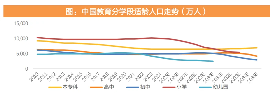 学前、小学、初中、高中的学龄人口将分别在 2020 年、2023 年、2029 年、2032 年达到峰值,之后呈现快速减少趋势。届时,未来就业人口结构也将有所改变。