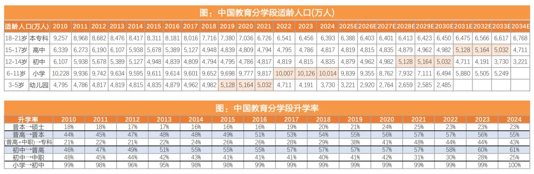 教育与就业市场结构性变化:1)学龄人口梯次下滑:学前、小学、初中、高中适龄人口将分别于 2020 年、2023 年、2029 年、2032 年达峰后减少,教育市场面临结构性调整。2)青年就业压力有所显现:2025 年 9 月全国城镇青年调查失业率升至 18.9%,处于年内较高水平,青年就业市场面临一定压力。3)蓝领市场崛起:2024 年蓝领就业规模达 4.25 亿人,68% 的 90 后涌入该赛道;2013-2024 年蓝领月均收入累计增长 114.4%,与白领收入差距从 2.17:1 收窄至 1.37:1,预计 2030 年高技能蓝领缺口或达 5000 万。