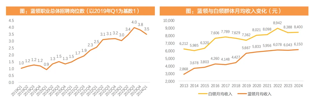 蓝领与白领收入差距持续收窄,部分岗位未来或超白领。根据《报告》发布的数据显示,2013-2024 年蓝领月均收入累计增长 114.4%,年均增速 7.2%;同期白领收入累计增幅 35.2%,年均增速仅 2.8%。未来三年,随着工业互联网渗透加深,蓝领收入仍有上行空间,部分城市的高技能岗位月薪有望逼近 7000-8000 元,与白领差距进一步缩小。