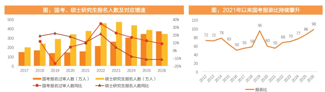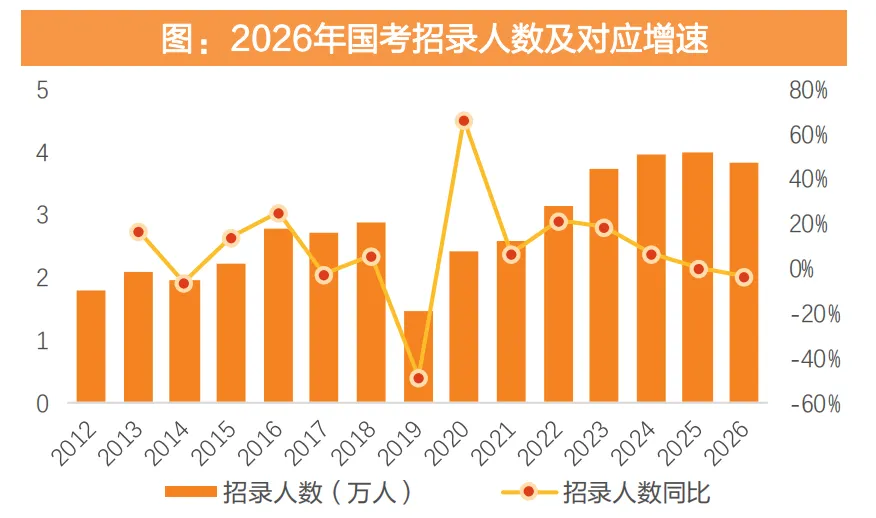 城镇化趋势长期延续,基层治理人才缺口打开,叠加高校毕业生人数上升及宏观经济影响,公考热度长期高涨,参考人数持续上升。从招录规模来看,国考计划招录人数在近十年呈现「先降后升再微降」的趋势。2019 年因机构改革,招录人数降至 1.45 万人,为近十年最低;2020-2025 年逐步回升,26 年则小幅回落至 3.81 万人,减少 0.16 万人。然而,实际参考人数持续攀升。2023-2026 年参考人数从 152.5 万增至 283.1 万,4 年间增长 85.6%,年均增幅超 21%,远超招录人数的增长幅度。