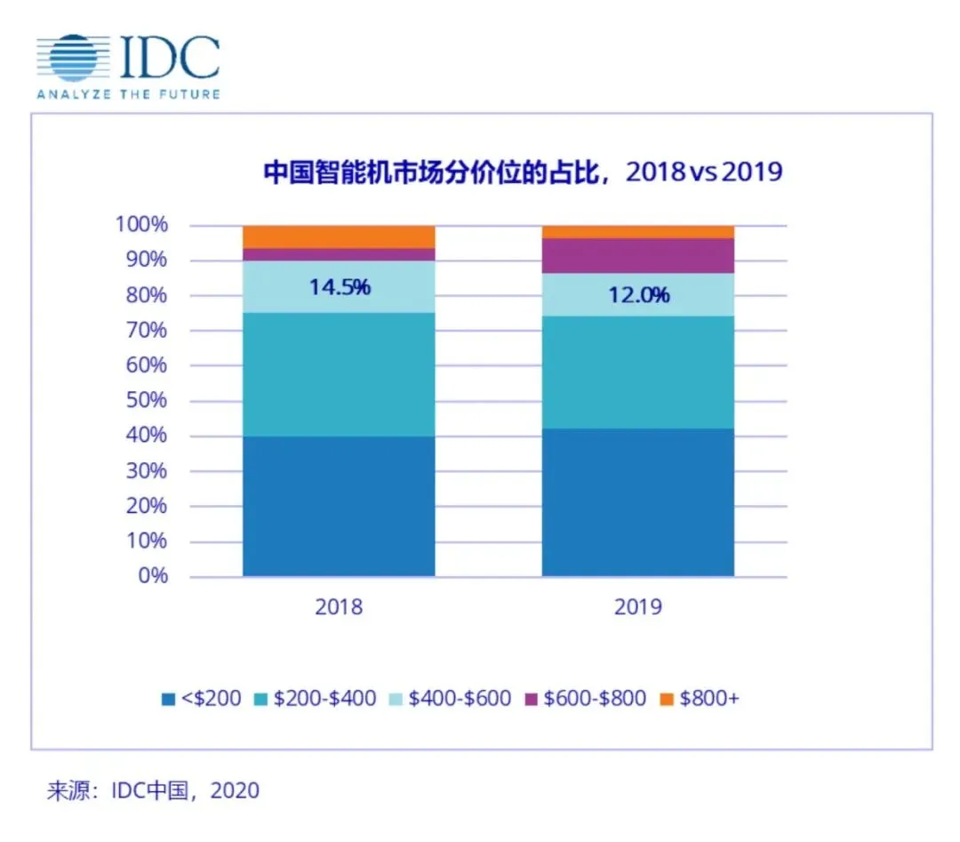 另外就是不同价位段的手机了,IDC报告显示,2019年中国手机市场占比最大的还是小于200美元即1500元以下的机子,随后是200-400美元,至于iPhone SE 2所在的中高端价格段(400-600美元)在中国整体手机市场占比12%。