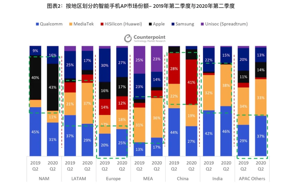 近日,市调机构Counterpoint发布了一份2020年第二季度(4-6月)全球智能手机AP (应用处理器)的市场报告,除了常规的分析统计各大品牌处理器的市场份额排名外,还分享了不同地区各大品牌的占比。