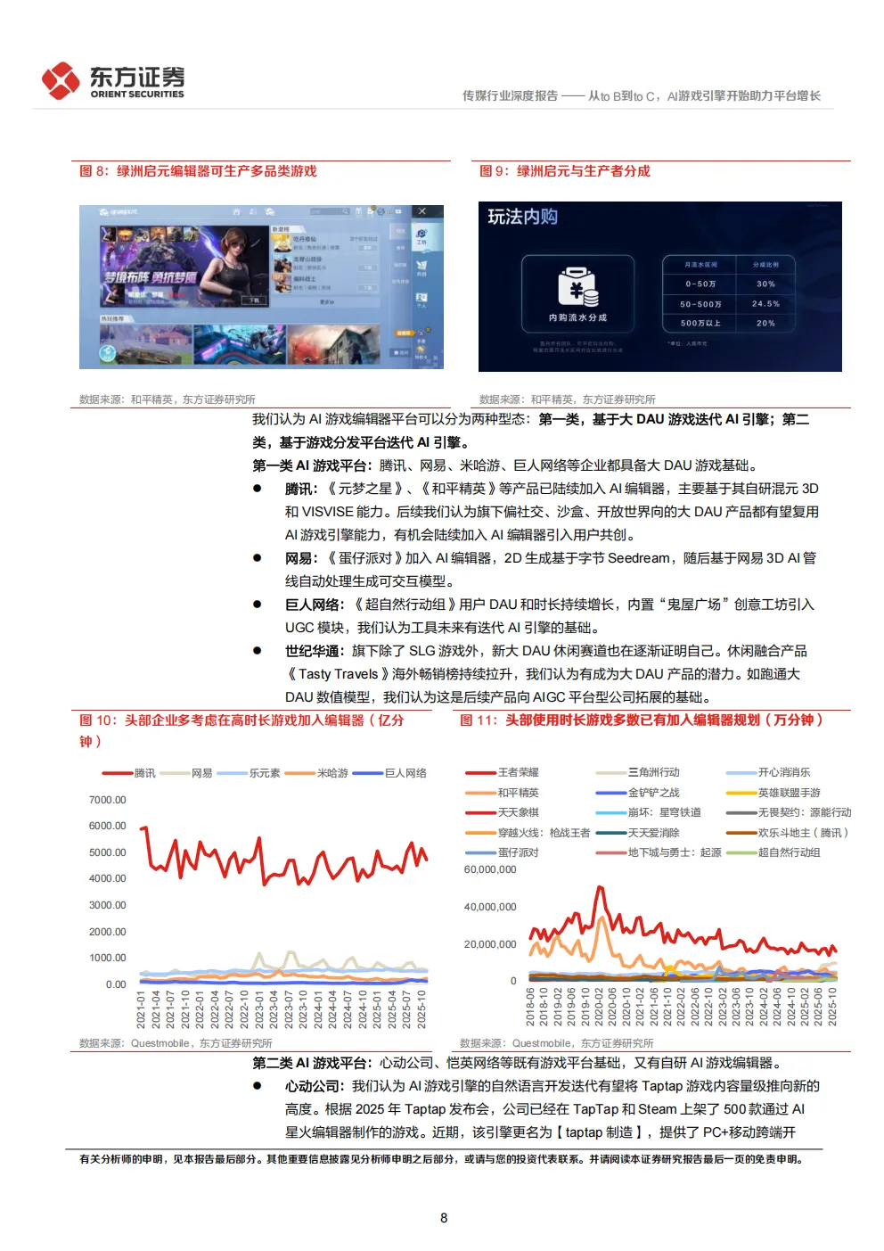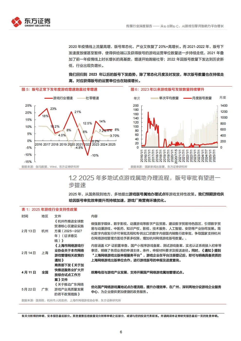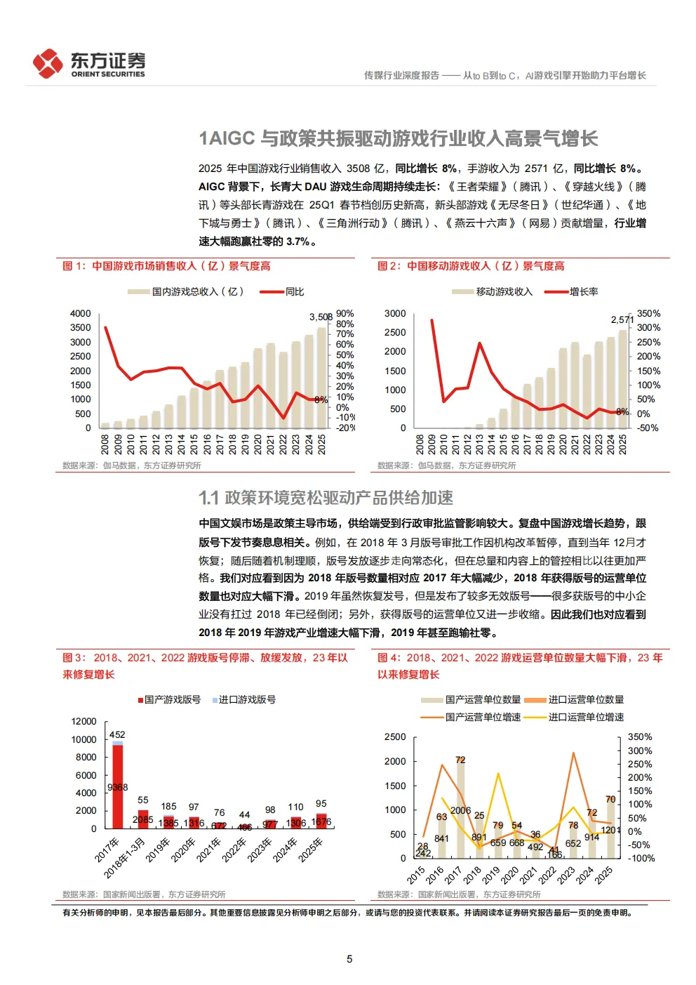 AI 与政策驱动游戏内容供给持续上行: 25 年中国游戏销售收入同比增长8%,大幅跑赢社零的3.7%。老游戏层面,AI 驱动长青游戏DAU 与流水持续走高;新游戏层面,中国游戏市场较为特殊,在供给端是政策主导市,版号数量直接决定了行业增速和企业立项信心。2025 年监管层面有较大的变化,版号试点属地办理直接使得产品修改和审批加速,版号下发速度逐月上行。