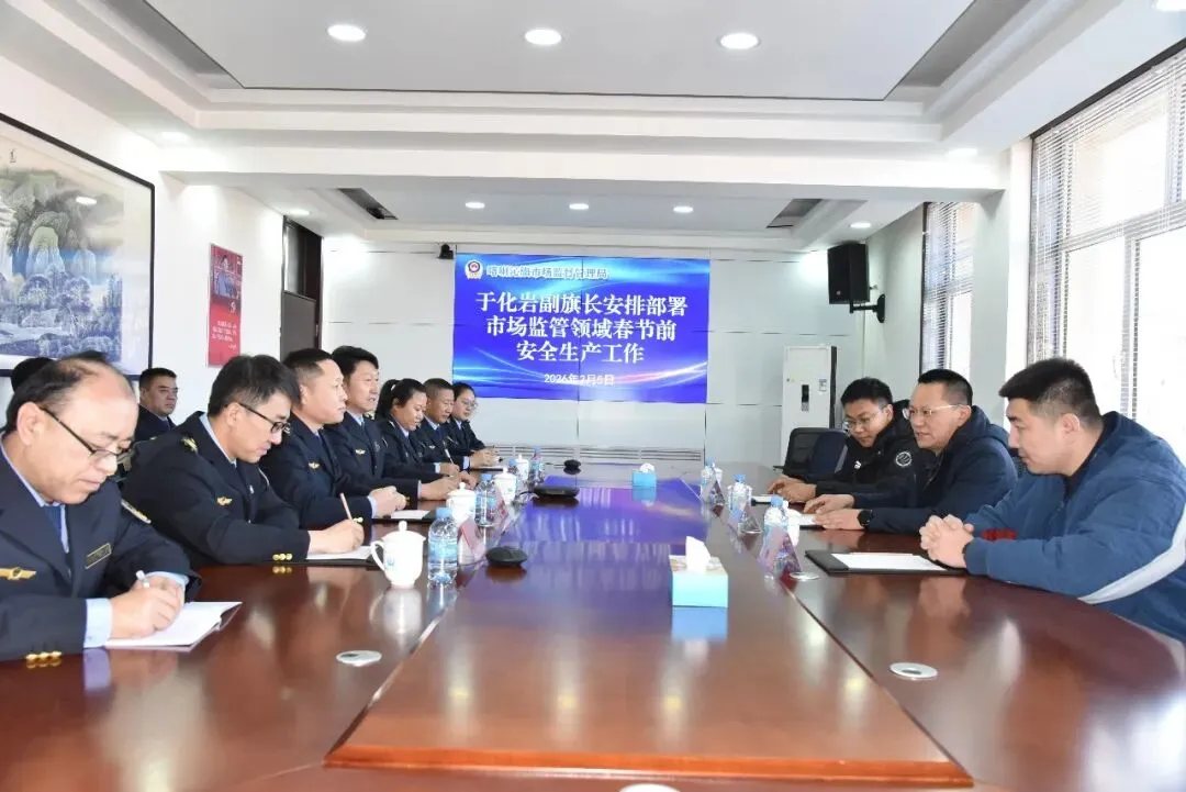 于化岩指出,春节是群众消费的高峰期,也是市场监管工作的关键期,市场监管部门要进一步提高政治站位,强化责任担当,加强部门联动,紧盯重点领域、重点环节,加大监管力度,确保节日期间市场秩序稳定有序。一要严格落实食品安全“四个最严”要求,加强食品生产经营全过程监管,严防发生区域性、系统性食品安全问题。二要规范市场价格秩序,加强民生商品价格监测,严厉打击哄抬物价、价格欺诈等行为,维护市场价格稳定。三要筑牢安全防控底线,加大特种设备、产品质量等重点领域检查力度,及时消除安全隐患,保障人民群众生命财产安全。四要做好应急值守和消费维权工作,畅通投诉举报渠道,完善应急处置预案,确保节日期间突发情况及时响应、高效处置,守护群众度过欢乐、祥和的春节。