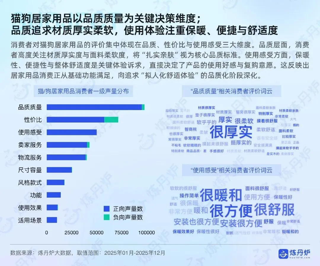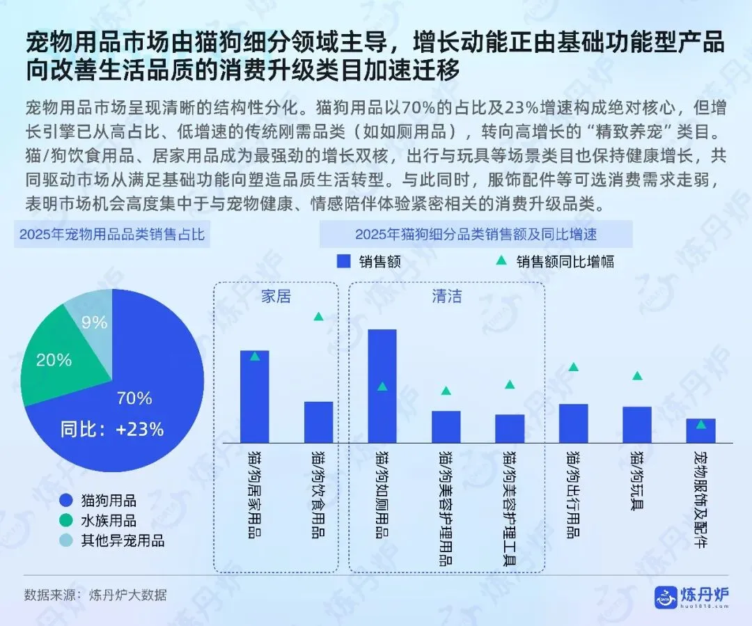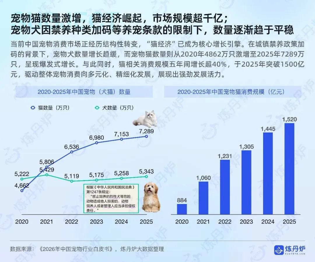 2026中国宠物市场破四千亿元,猫经济领跑,犬数量趋稳。高知白领女性成消费主力,线上天猫京东占七成,线下宠物店医院做体验。食品刚需稳增,风干烘焙、功能粮、鲜食、抗过敏粮升温;用品向居家舒适、智能如厕、户外出行、人宠共居场景升级。