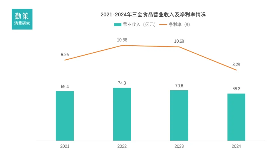 三全食品在2021年至2024年间的营业收入整体呈现波动下行的态势。其营收从2021年的69.43亿元先升至2022年的74.34亿元,但随后连续两年下滑,至2024年已降至66.32亿元,三年复合增长率为-1.52%。这种下滑主要源于传统零售渠道(C端)面临的巨大压力,特别是商超客流减少以及水饺、汤圆等核心品类陷入价格战,导致其收入承压。尽管公司在餐饮市场(B端)的开拓取得进展,以及电商渠道表现亮眼,但仍未能完全抵消主业的疲软。同期,公司的净利率也经历了明显的下滑,从2022年的10.79% 下降至2024年的8.18%。盈利能力减弱的主要原因是行业竞争加剧迫使公司增加了促销投入,同时高毛利的饺子、汤圆等产品收入占比下降,共同导致毛利率承压。此外,公司为拓展市场而加大费用投入,尤其是电商渠道的推广,使得期间费用率有所上升,进一步侵蚀了利润空间。数据来源:企业财报、勤策消费研究